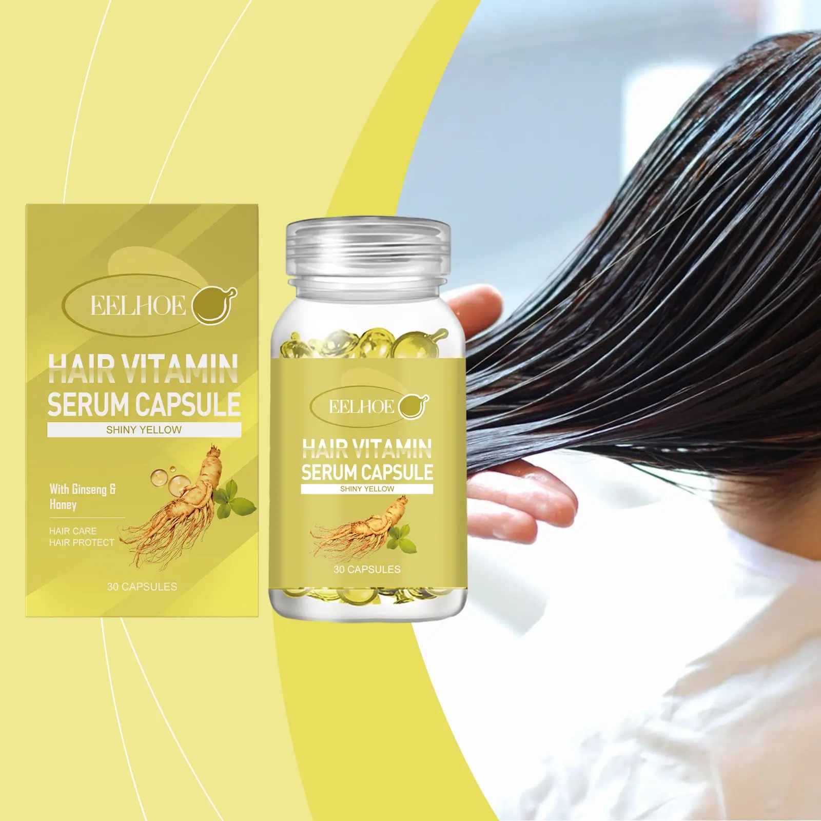 Cápsulas de aceite, Sérum para el cuidado del cabello, suero capilar suave e hidratante. Nuestras cápsulas (amarillas) contienen extracto de ginseng, extracto de miel y extracto de hoja de aloe vera.