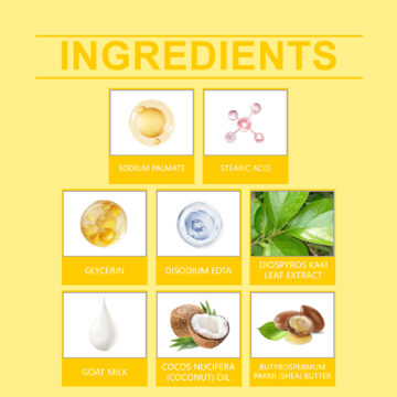 Our persimmon goat milk deodorant soap contains sodium palmitate, stearic acid. It gently lathers the skin and removes sweat and dirt. It helps to remove body odor and gives off a faint persimmon fragrance after washing. Its application is simple: rub the product between the wet palms until a rich lather is formed. Apply the foam to the face and body and gently massage it into to help care for the skin. Finally, rinse with clean water. And it can gently cleanse, cleansing the surface of the skin.